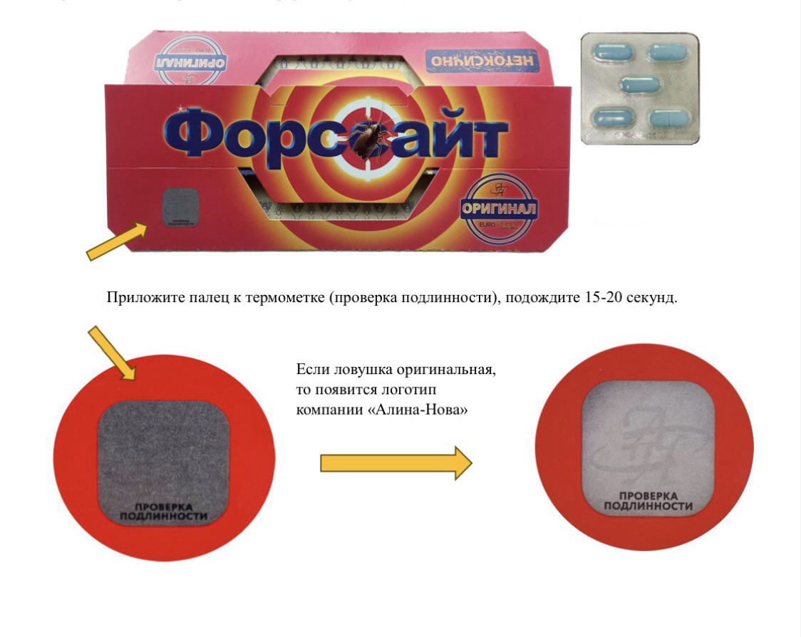 С ноября 2025 года в левом нижнем углу ловушки появилась новая защитная термометка, срабатывающая на тепло пальца. Если ловушка оригинальная, то при непродолжительном воздействии тепла на метку, проявляется логотип компании "Алина-Нова".